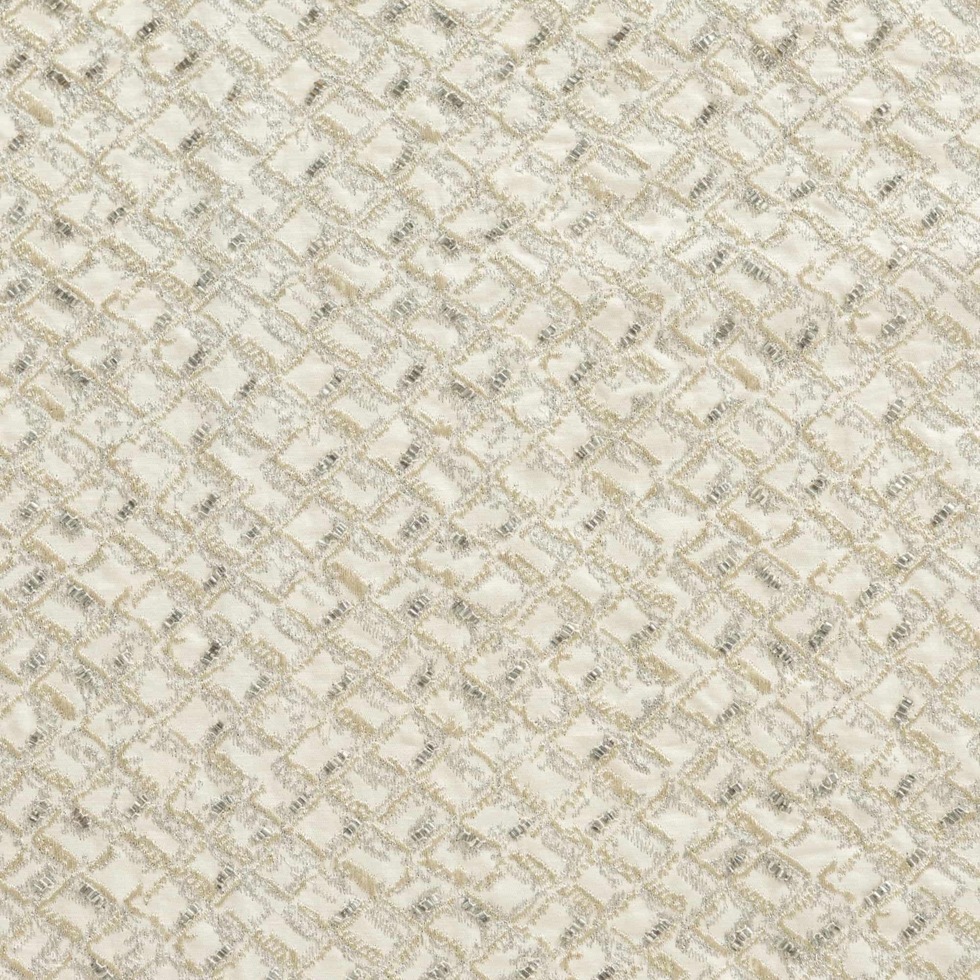 Gild, a highly embellished small scale geometric design on a cotton and linen satin ground with embroidered metallic threads and stunning white faceted bugle beads. The design is reminiscent of an engraving in metal and makes truly special curtains and incredibly decorative cushions. Upholster backs of dining chairs and occasional armchairs so on and so forth for that highly attractive finish.